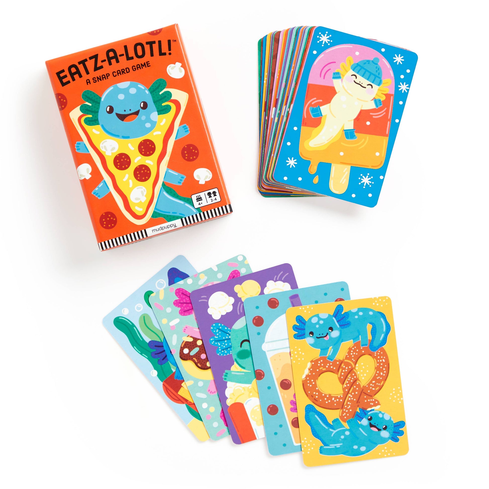 Eatz-a-lotl by Mudpuppy a punny card game that features an adorable axolotl, the giant salamander that is native to Mexico. Our card game is a take on the classic game of Snap – a fast-paced matching game suited for children of all ages. Players try to be the first to spot a match and shout “Eatz-a-lotl!” to collect cards. The adorable artwork features a hungry axolotl enjoying pizza, boba tea, popcorn, and more.