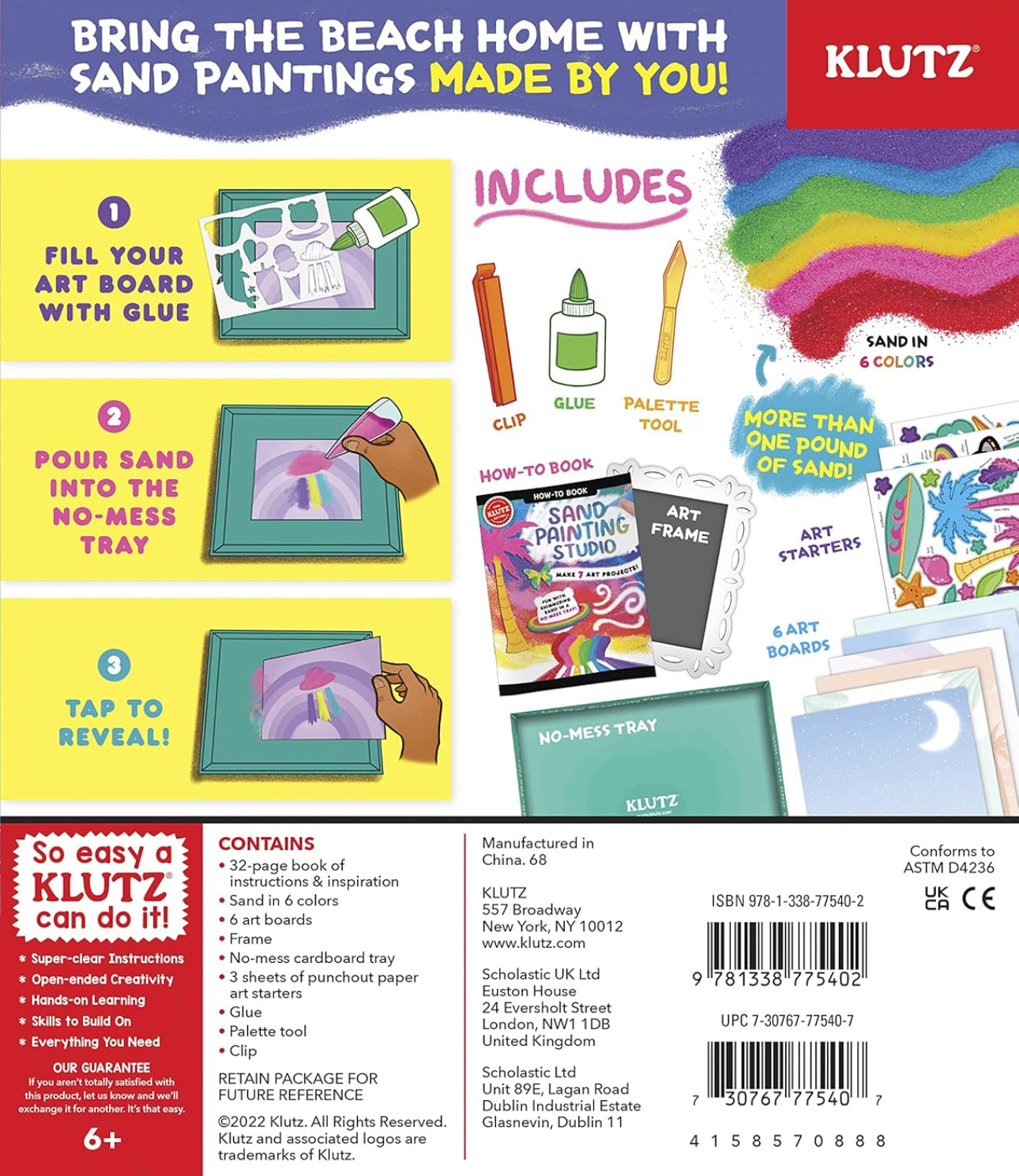 Make mesmerising sand art, inspired by swirling tie-dye colours! This kit include 6 artwork boards, a photo frame and lots of tropical-inspired punch-out motifs from sea turtles to swirly ice cream cones with positive words of wisdom. Paint the artwork with glue and a custom-tooled palette knife, them drizzle your sand in organic swirls to create sand art that looks just like your favourite tie-dyed t-shirt. A glue-together chipboard frame helps you display your artwork, or your favourite vacation photo. Sand-sational!